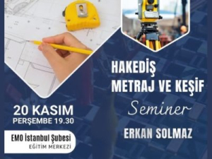 Hakediş, Metraj ve Keşif başlıklı seminerimiz, Erkan Solmaz`ın sunumuyla 20 Kasım Perşembe günü saat 19.30’da EMO İstanbul Şubesi Eğitim Merkezinde gerçekleştirilecektir.